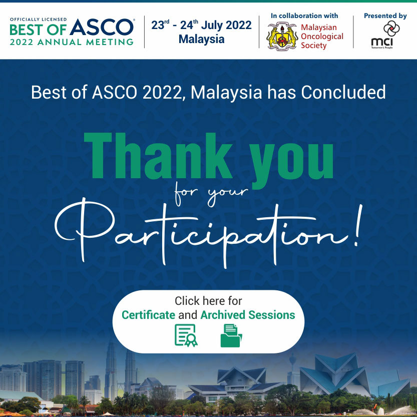 We are proud and happy that the past edition of Best of ASCO Malaysia was relished by all of you. During these challenging times, we thrive to provide the best care for our patients and keep ourselves updated with the latest advancement in cancer care. Together with MOS, we endeavour to bring the latest updates and best evidence-based practice from ASCO 2022 to you.